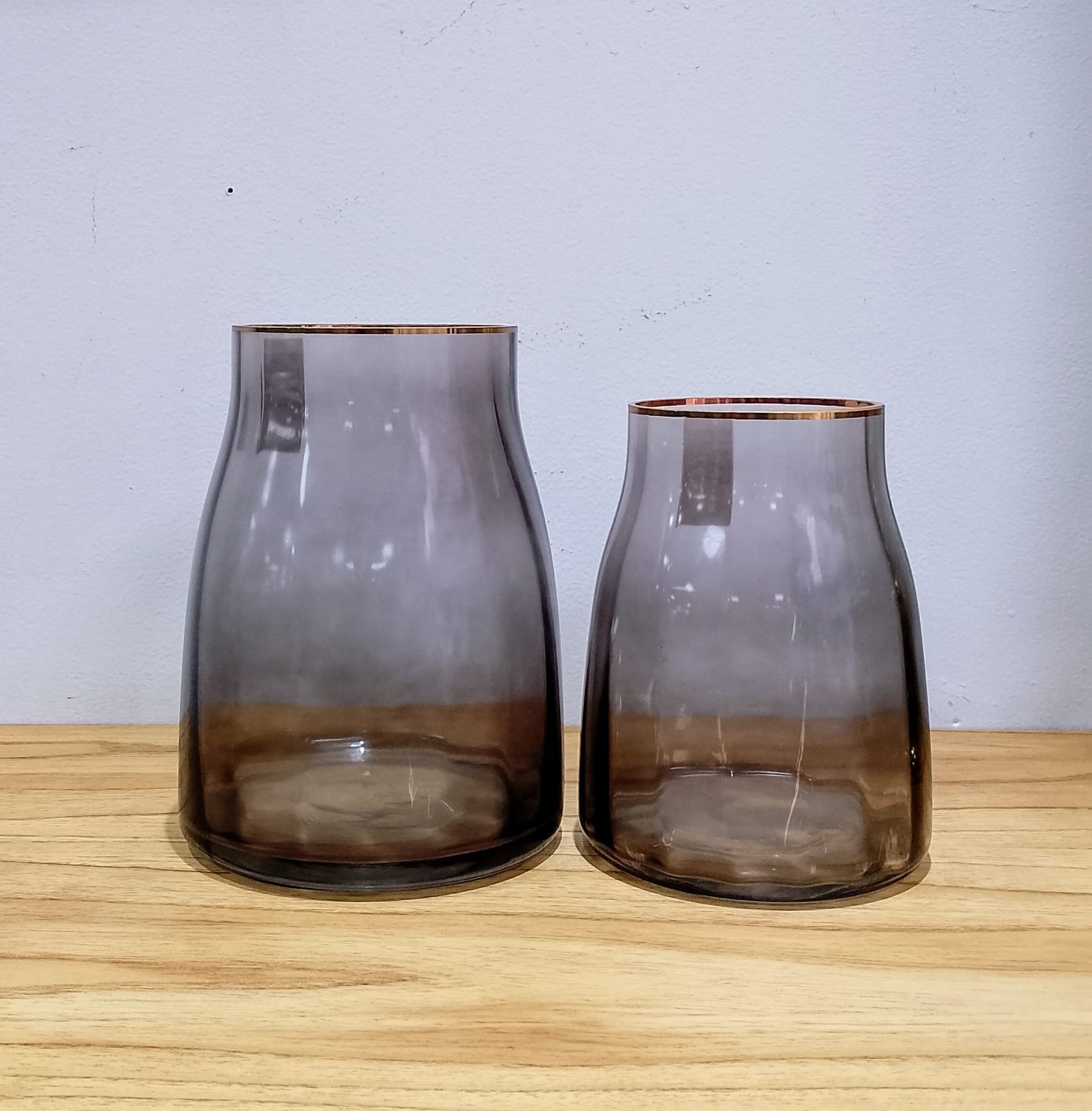 FLORERO DE VIDRIO HUMO BORDE DORADO MEDIANO